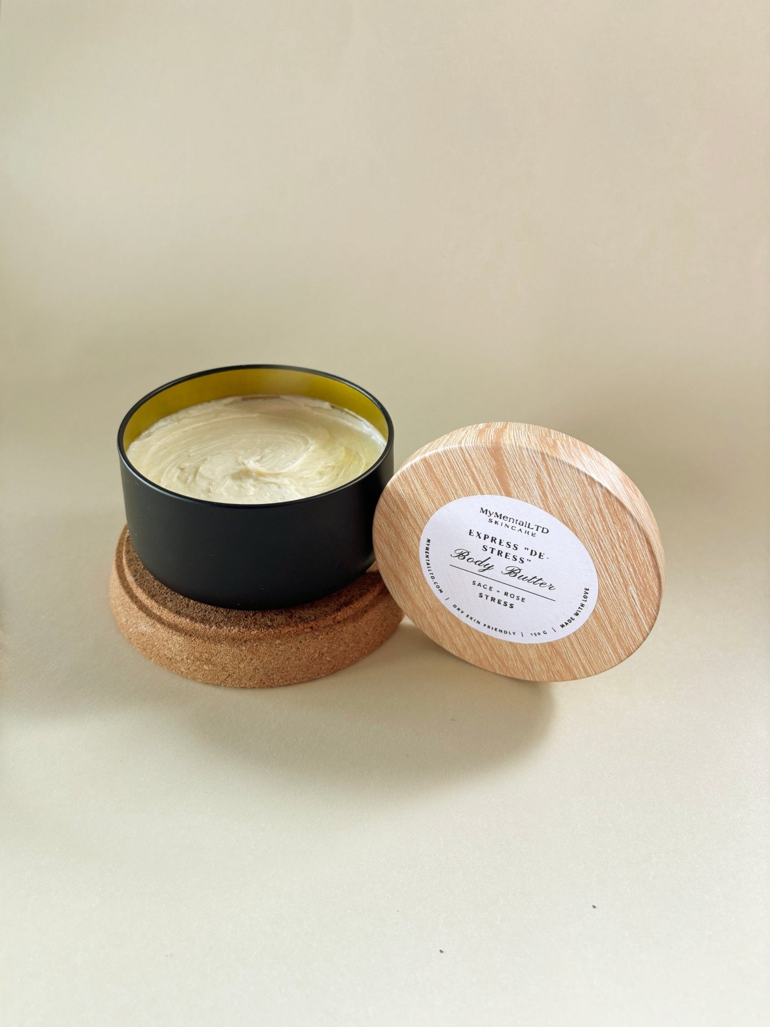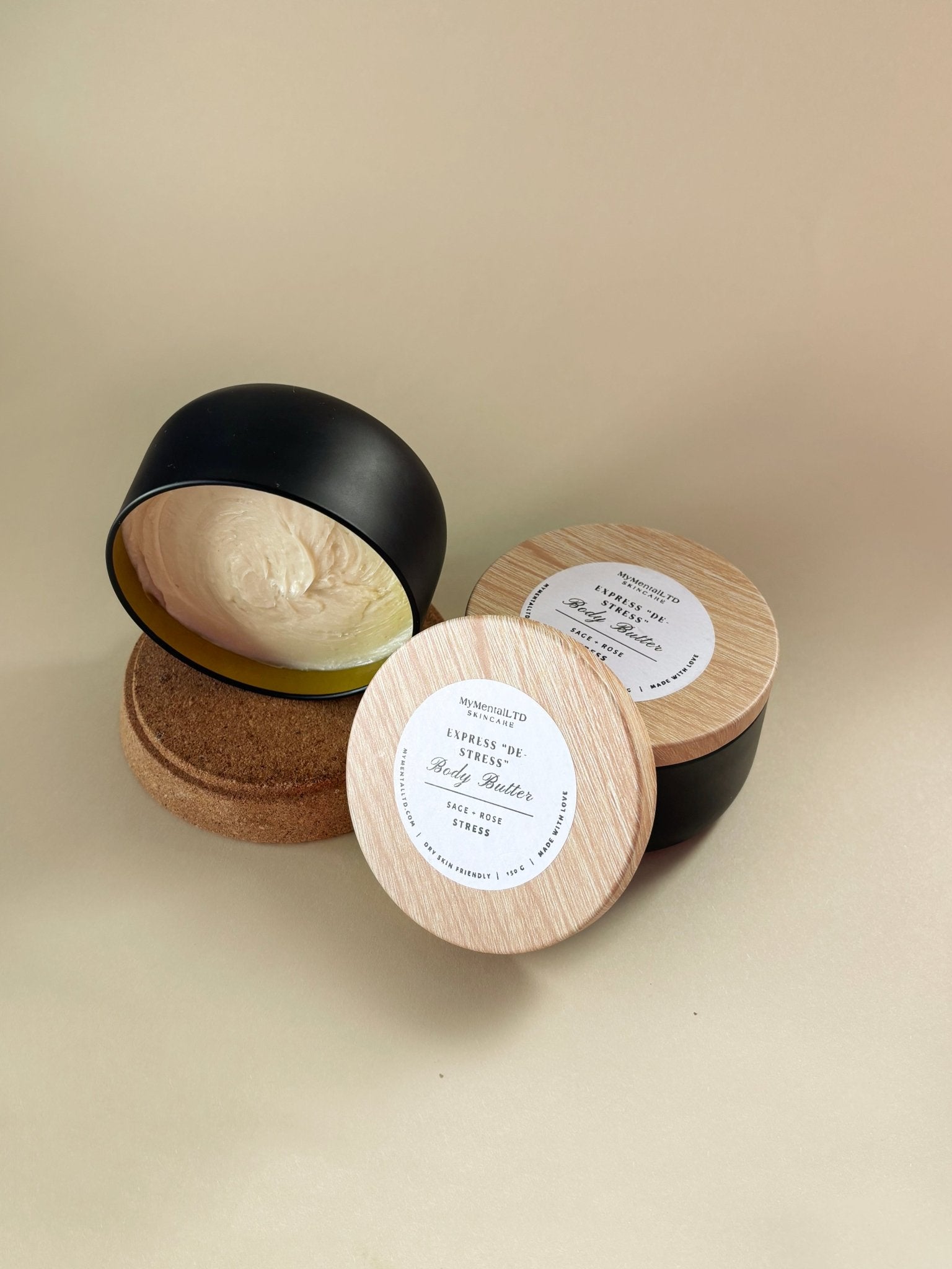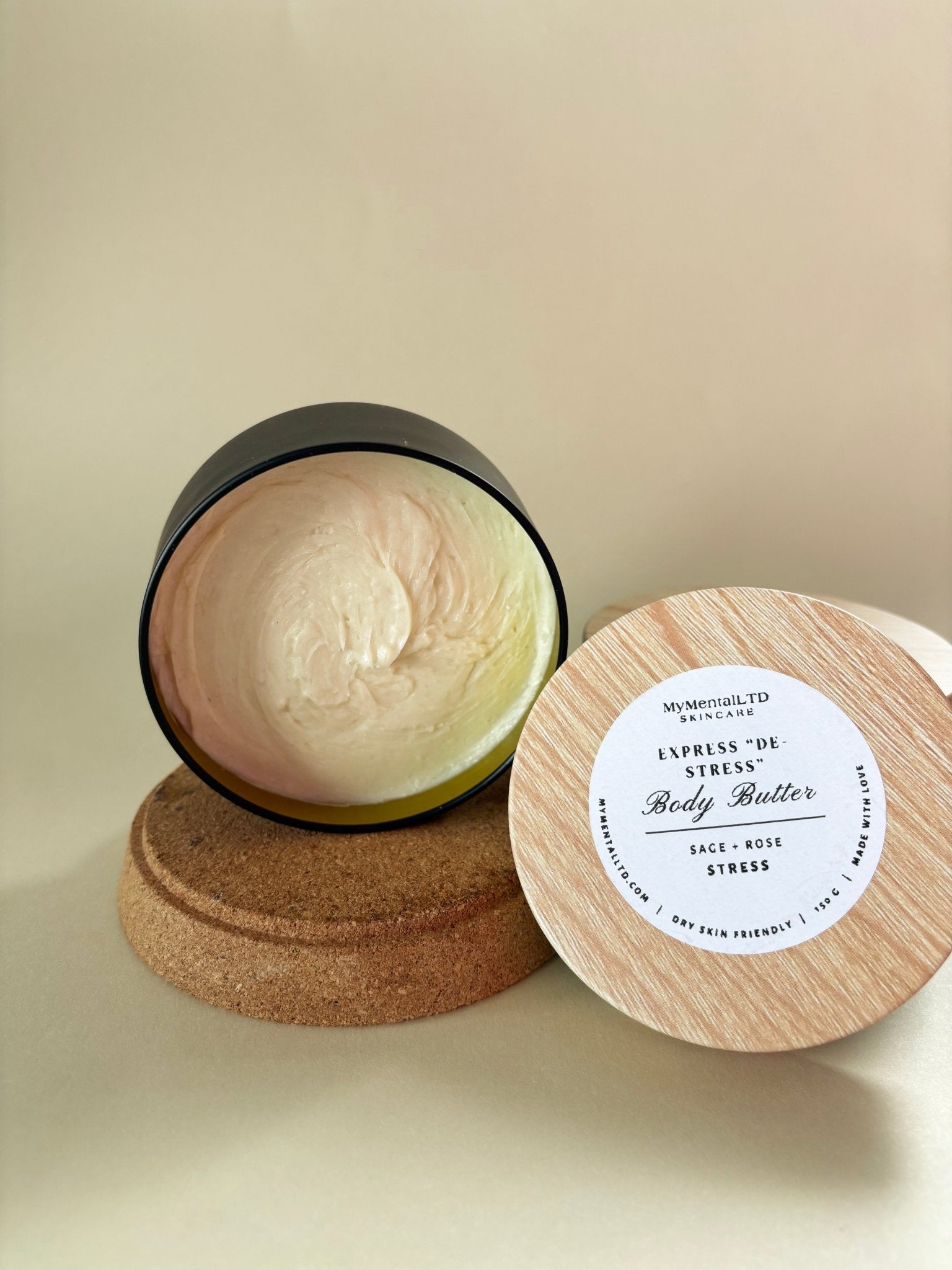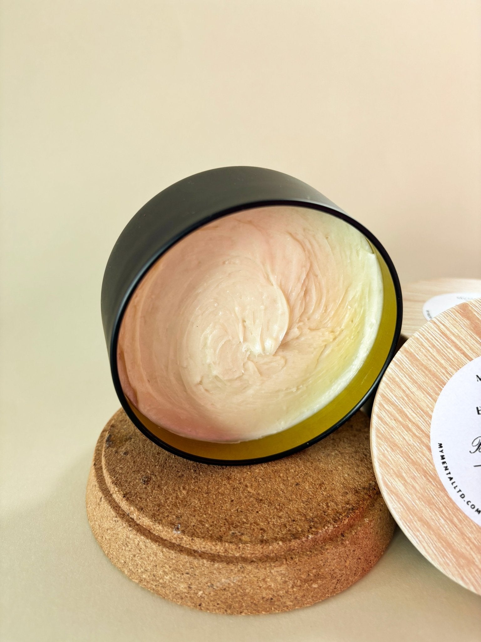 The inclusion of essential oils in our Body Butter formula is not by coincidence; these oils are known for their mood-enhancing and stress-reducing properties. Jasmine Oil, for example, is known for its stimulating and activating effects, making it particularly effective in improving mood and reducing symptoms such as stress and depression. Rose Oil is another vital ingredient in our formula. It's scientifically acclaimed for its ability to minimise anxiety and stress, even in high-stress situations like childbirth, making it a potent ally for mental well-being. Sage Oil, known for its potential to lower stress levels, is also included in the mix, adding another layer of tranquility and peace to the experience of using our Body Butter.