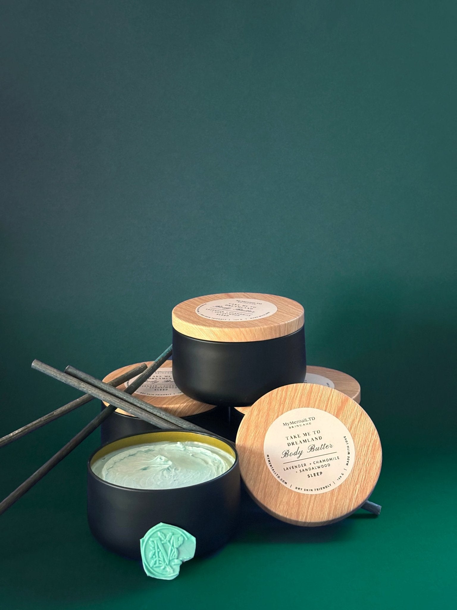Our "Take Me to Dreamland" Body Butter is a meticulously crafted sleep aid, designed to lull you into a realm of peaceful slumber. With the calming scent profiles of Lavender, Chamomile, and Sandalwood, this body butter is your perfect bedtime companion.