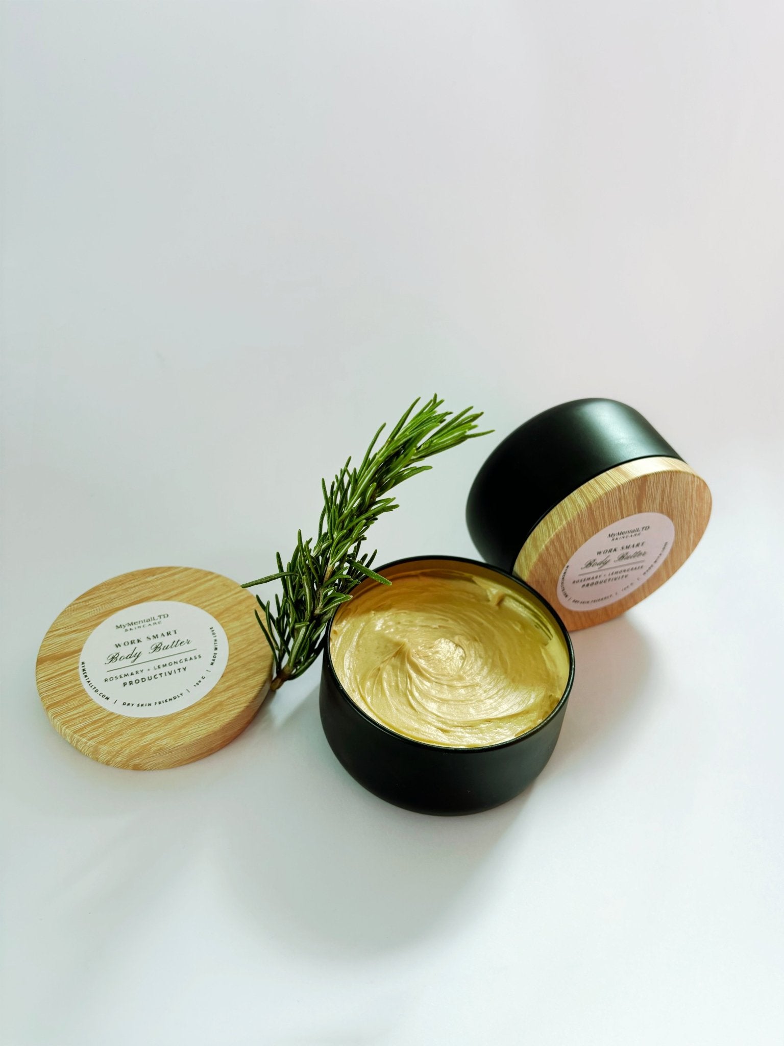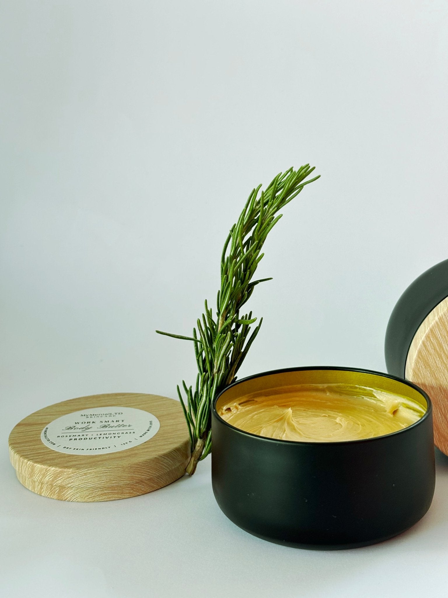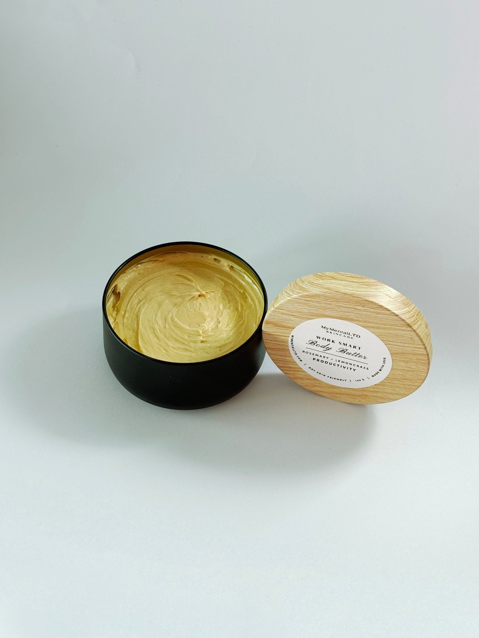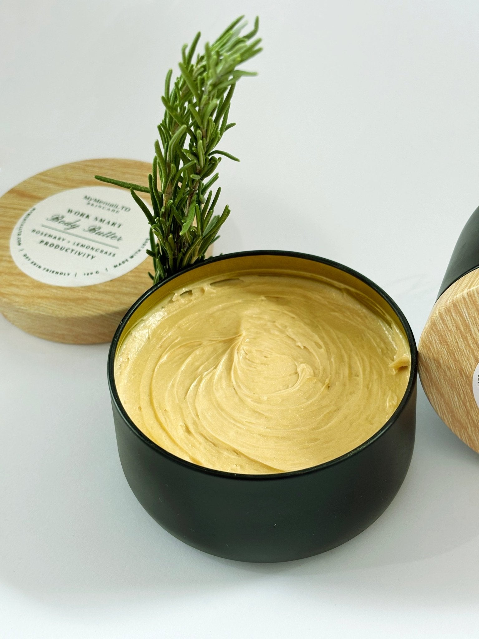 Enhance your productivity with our Work Smart Body Butter. Skillfully blended with the invigorating scent of Rosemary and the soothing aroma of Lavender, this body butter is designed to stimulate your senses and bolster your productivity levels. The strong, refreshing fragrance of Rosemary, paired with the calming scent of Lavender, creates an uplifting environment that sharpens your focus and boosts your cognitive function. Massage this body butter into your skin to enjoy a heightened sense of focus, motivation, and readiness to tackle your tasks.